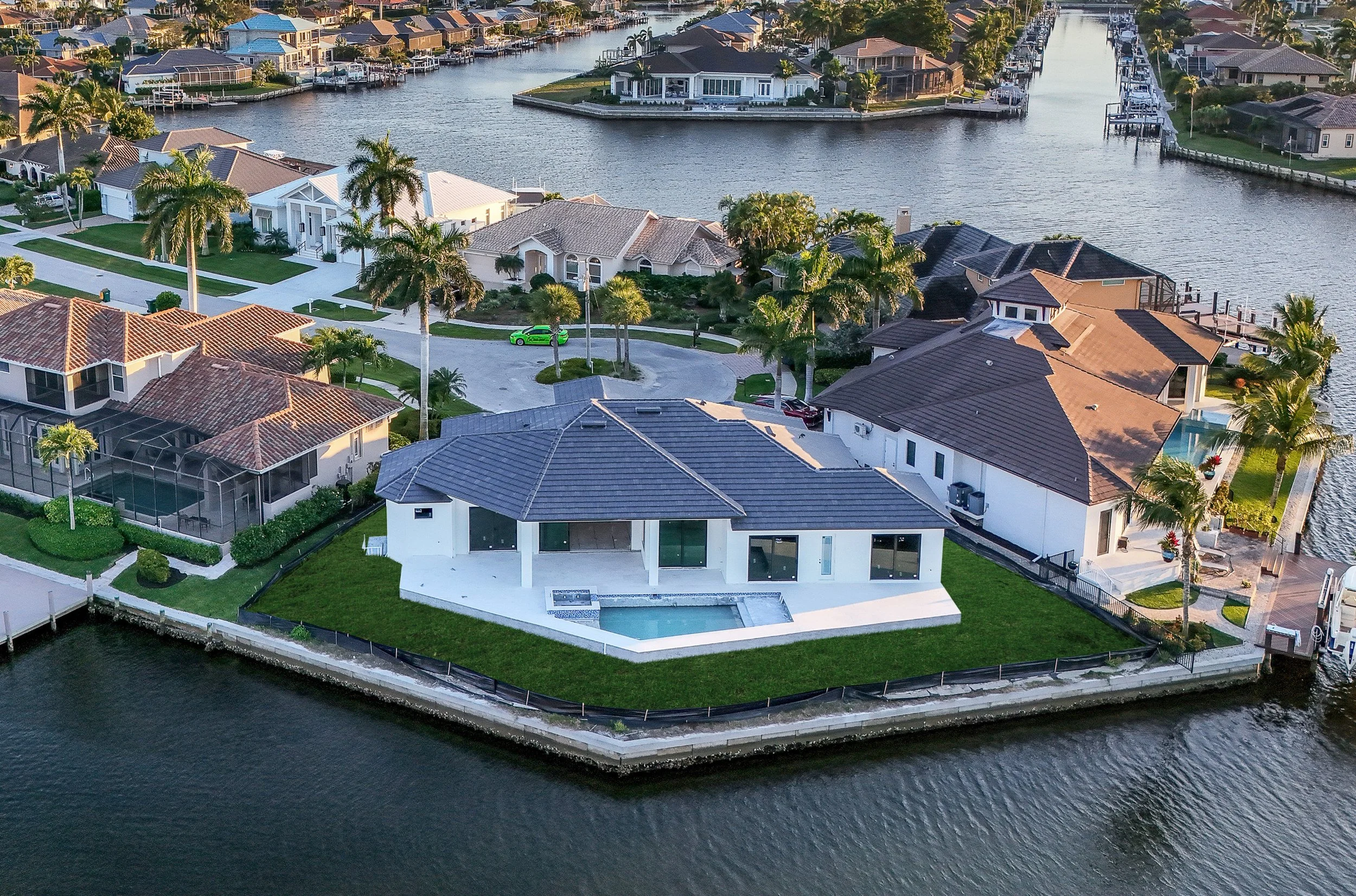NOW PENDING: This custom designer coastal home on a tip lot with 160'ft deep water frontage, wide waterway views and easy indirect Gulf boating access, is under construction by builder, NOVA Homes of South Florida. Welcome to the epitome of waterfront luxury living, on a private cul-de-sac in an upscale Marco Island residential neighborhood close to Island Country Club.