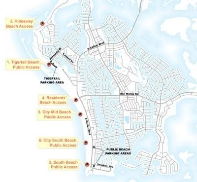 City South Beach Public Access: Midway on the island is this beach access, next door to the Hilton Hotel and located at 600 South Collier Boulevard at Winterberry Drive, this entrance is ideal for those staying at Marriott's Crystal Shores, offering convenient paid parking options at the public “Turtle” lot across the street.